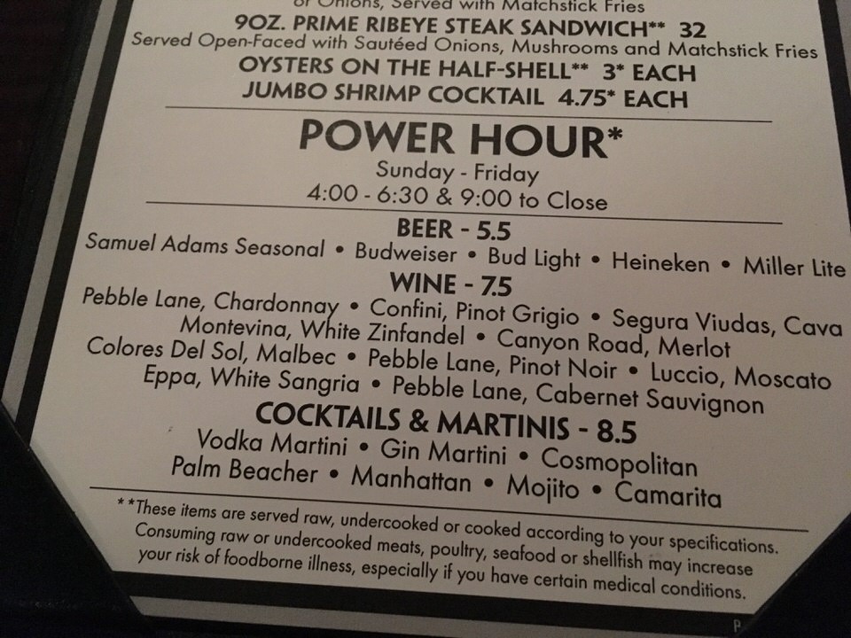 「Power Hour」がハッピーアワーのことで、土曜日以外の4:00-6:30、9:00-Closeに開催中とのこと。土曜日は開催していないところは注意が必要ですね。
