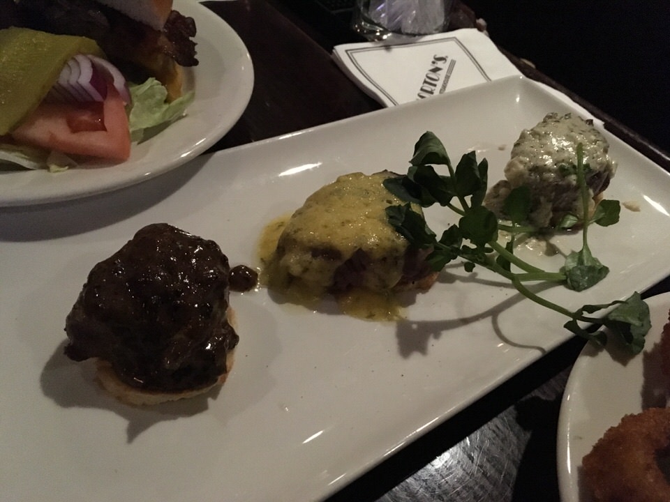 どれも美味しそうなのですが、今回はまず、9ドルのおつまみから「フィレミニヨントリオ(FILET MIGNON TRIO)」と奮発して21ドルの「モートンズプライムバーガー(MORTON’S PRIME BURGER)」を頼んでみました。