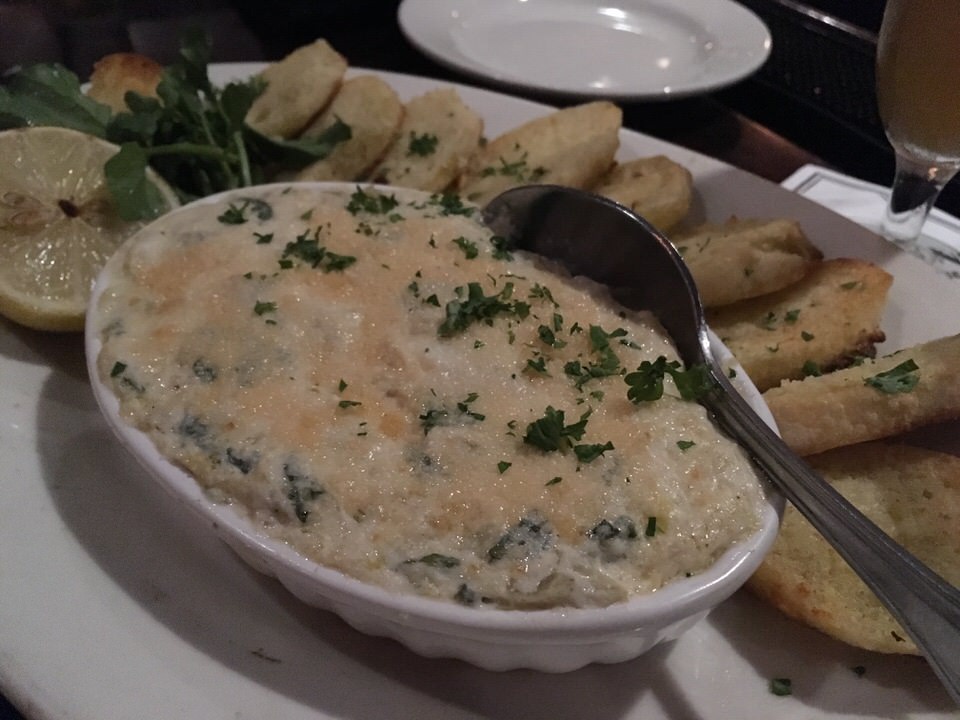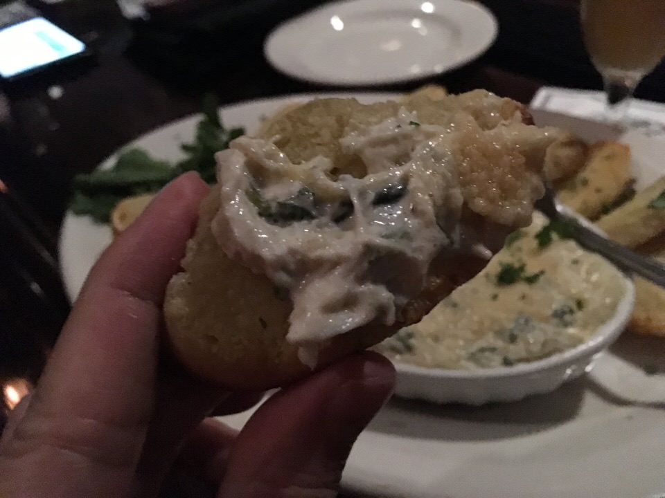 グラタン皿にはカニの身とほうれん草とアーティチョークが入った温かいグラタンのようなものが入っていて、これをカリカリに焼かれたチーズの風味が香ばしいパンにディップしていただきます。