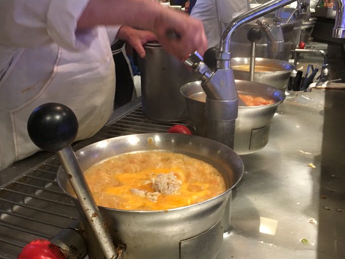 クラムチャウダーを食べていると、目の前のキッチンではシェフがパンローストを作りはじめました。