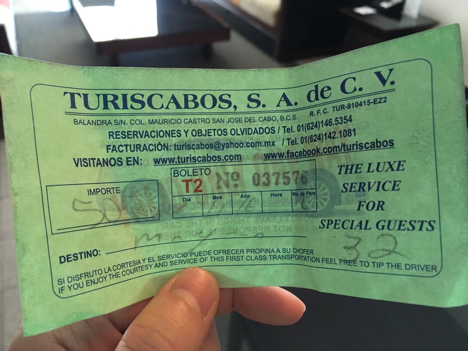 空港に到着すると、出口のところにタクシーやシャトルバスのカウンターがあり、その手前には親切な?おじさん達がどこに行くのか聞いてきます。事前の調べでロスカボスの治安は良く、どのタクシーに乗っても大丈夫との情報を得ていたので、安心して、このおじさんに行き先の「グランド・マヤ・ロスカボス」の名前を伝えると、タクシーのカウンターに連れて行ってくれました。