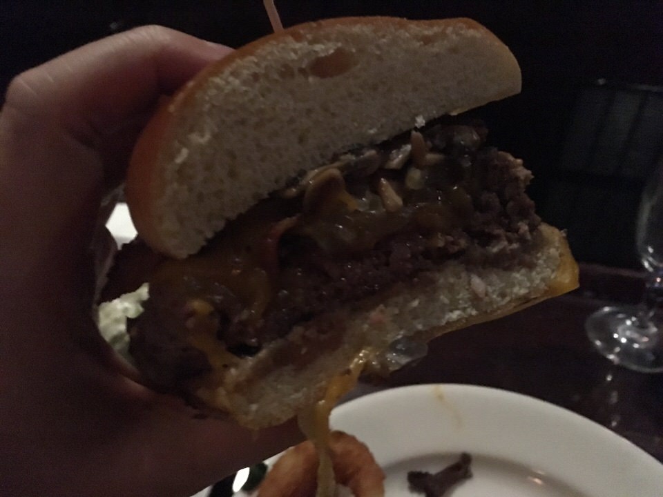 ハンバーガーの中身は分厚いパテのほか、マッシュルームにベーコン、チーズが入っています。マッシュルームはオニオンに変更でき、チーズは種類が選べます。