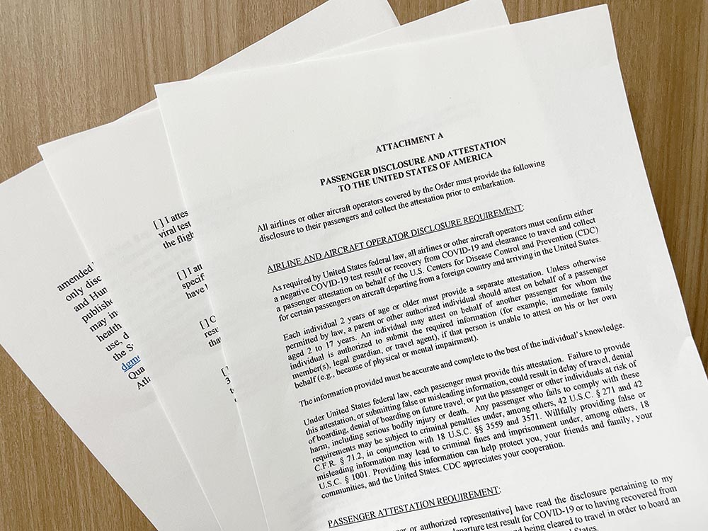 CDCの要請により陰性証明書と共に宣誓書が必要です。