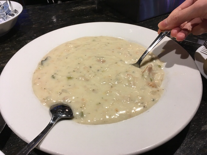 しばらくすると最初の1品がやってきました。クラムチャウダー ボウル Clam Chowder bowl 8.99ドルです。サイズはカップとボウルが選べますが、夫婦ともどもクラムチャウダー好きなので、ボウルで注文。
